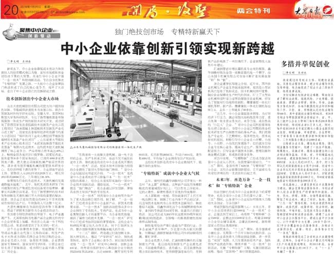 2015年1月25日的大眾日報?兩會特刊《獨門絕技創(chuàng)市場 專精特新贏天下――中小企業(yè)依靠創(chuàng)新引領實現新跨越》重點介紹了我公司技術創(chuàng)新的經驗,敬請關注。