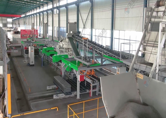 擠壓墻板生產線結構緊湊,自動化程度高,設備主機固定,墻板成型時物料受擠壓和振動同時作用,連續(xù)自動擠壓振搗成型,保證墻板具有良好的密實性和外形尺寸,成型后進行初凝養(yǎng)護。板坯移動方便,場地使用靈活、利用效率高。成型工段推料擠壓螺旋變頻調速,由中央控制器調整控制灰渣板成型的密實程度,實現灰渣板的連續(xù)自動流水線生產。由于采用低水灰比的干硬性混合料擠壓成型,可得到強度和密實度較高的空心墻板。自動化連續(xù)生產,效率高,質量一致性高,保障了墻板品質。廣泛用于框架結構和鋼結構建筑物。